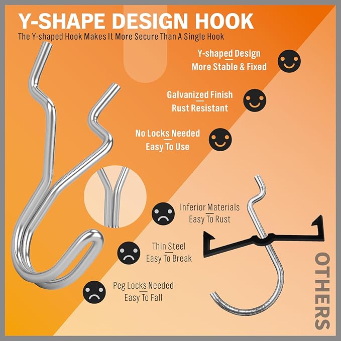 - Pegboard Hooks Assortment – Ultimate Organization Kit : This 309-piece pegboard hooks assortment is a complete garage organization solution, featuring 17 different types of heavy-duty pegboard hooks, 12 orange pegboard bins, curved hooks, angled hooks, straight hooks, and ring tool holder, multi tool rack, and 120pcs of them are stainless steel peg locks for fixing hooks. Capable of fitting both 1/8" and 1/4" pegboards, it’s perfect for tool organizers and storage in workshops, kitchens, and retail displays