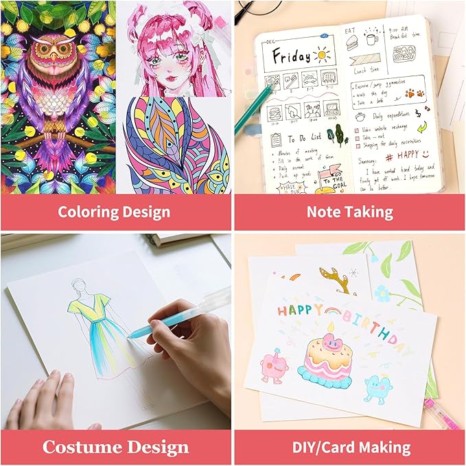 - 【 Multi-Purpose Usage】The gel pen set is an ideal art supply for adults and kids, perfect for coloring books, bullet journaling, sketching, drawing, writing, comics, and any other designs on Scrapbooks, School Projects, Party Invites, Greeting Cards, DIY Decor, Letters to Friends or Family.