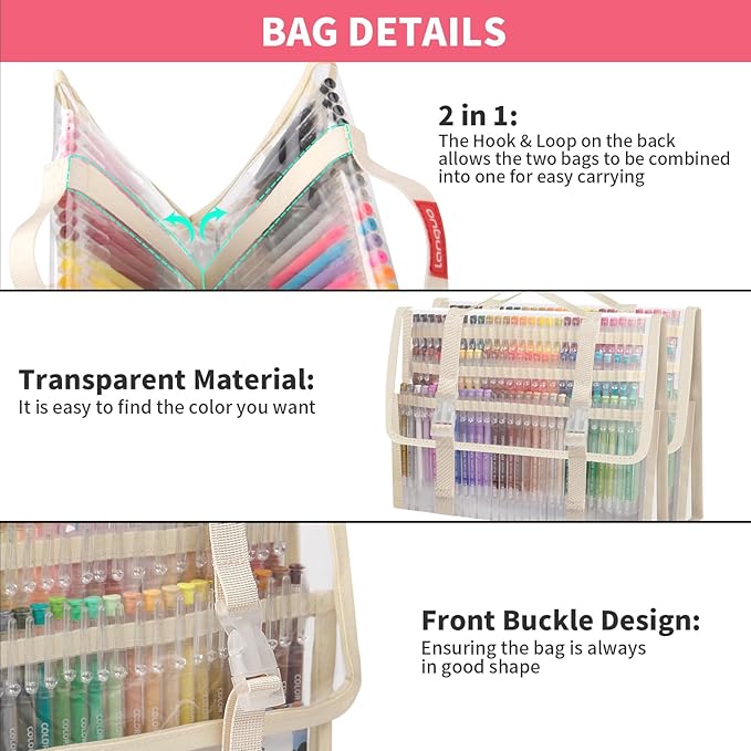 - 【User-Friendly Design】①Transparent bags for quick selection, and the hook & loop design allows the two bags to be combined for easy carrying. ②Transparent barrels allow you to monitor the ink level and identify the color efficiently. ③The pen clip on the lid enhances the aesthetics and non-slip function.