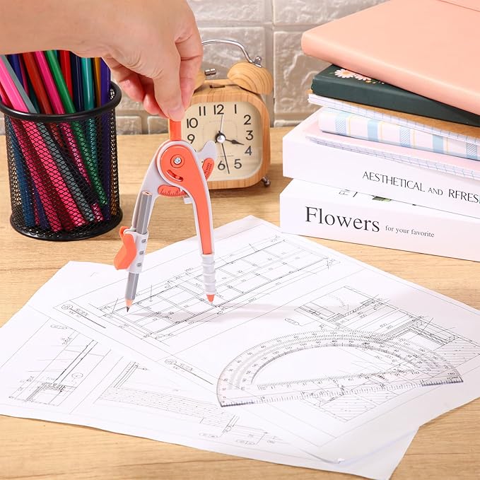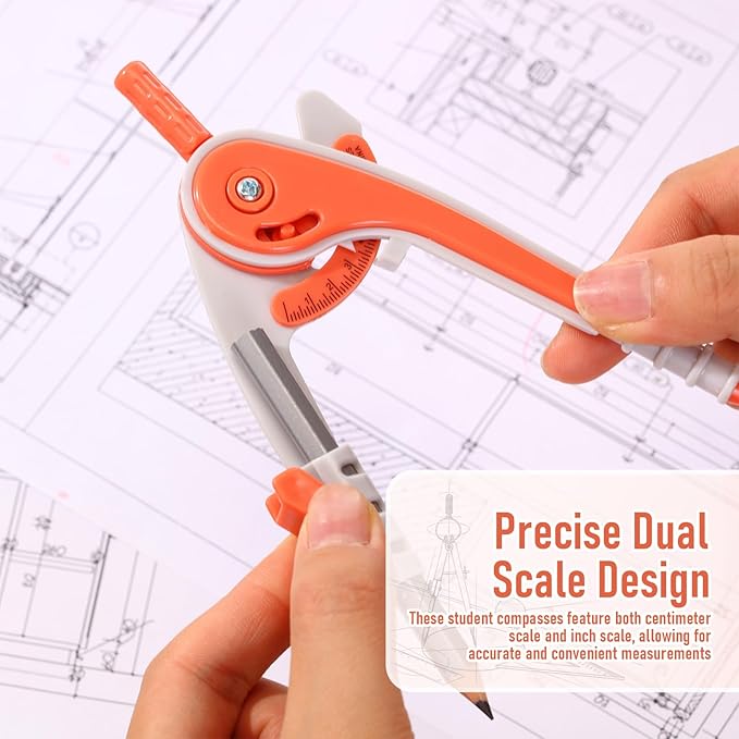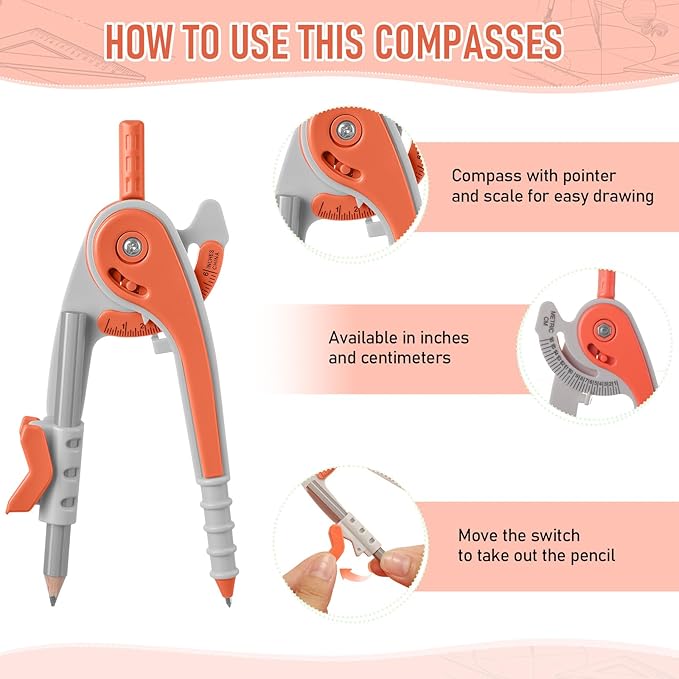 - 2 Diverse tips design compass: compass is made of plastic, sturdy mechanism can hold a radius well; The opposite side of the pencil end is an adjustable separated jaw, which allows you to fix the pencil