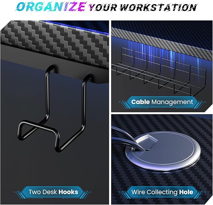 - Organize Your Workstation : 55"x24" eco-friendly desktop provides you with a spacious workspace. Integrated cable management tray and hooks for headphones or bags, ensuring a tidy workspace. Say goodbye to cable chaos and focus on what matters!