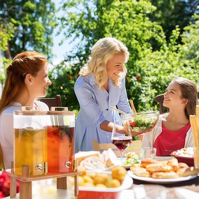 - 【Including Accessories】 This drink dispenser set includes 2pcs large 1.5-gallon pitcher, 1 wood stand, 2 gold colored stainless steel faucets , 2 bamboo cover with airtight valve, 2 cork coasters, 4 anti-slip strips for stand legs, 12 round clear silicone gaskets, 1 wrench, and 1 installation instruction.