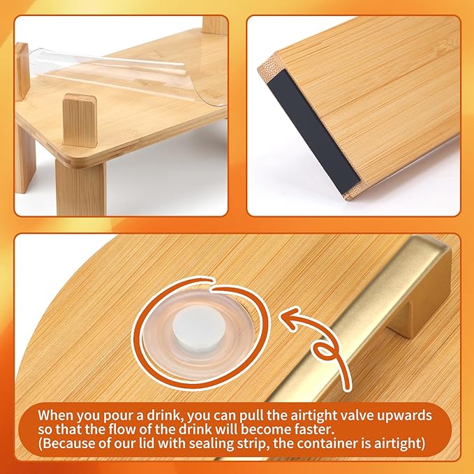 - 【Beautiful Gold Faucet and Bamboo Lid】 The drink dispensers for parties comes with a high quality gold stainless steel leak-proof faucet and a beverage spill plug to ensure no dripping after pouring out the beverage, keep the table clean and tidy, and ensure long term reliability and durability. If the water flow from the spout is slow, the flow rate of the faucet will increase a bit when the airtight valve on the bamboo lid is pulled upward.