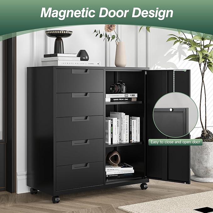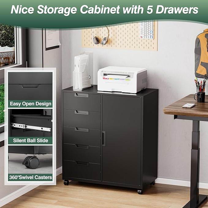 - 【Versatile & Practical】: This Space Saving file cabinet adds two shelf, one door and spacious top shelf for hold printers, office supplies, books, tools, boxes and files. 5 drawers can store stationery, Laptop, daily sundries, staplers, calculators and notes. it is a perfect addition to office, study or studio.