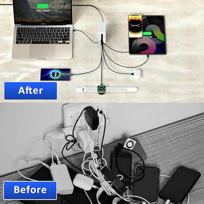 - 7-in-1 CHARGER STATION: Unlike most chargers with false advertising and slow output when multiple ports are in use, our USB-C charger station features 7 independent output ports to ensure that all your devices can be charged at full speed at the same time with no need for power sharing and disconnections. This 7-in-1 charger station will lighten your accessory load and help you create a neat and organized desktop.