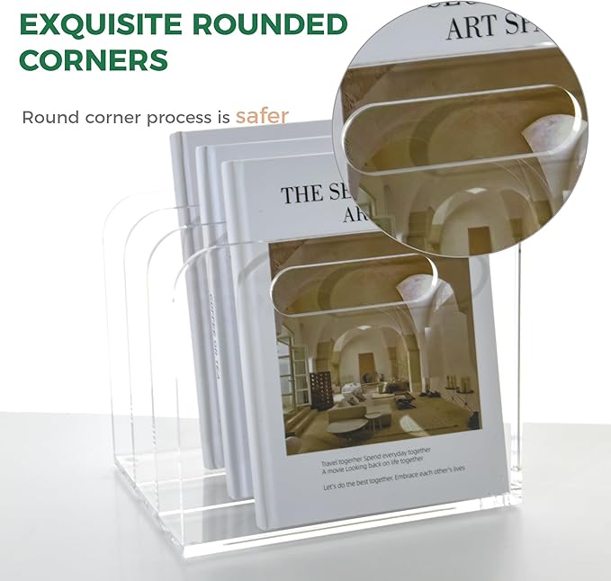 - Durable Construction: Crafted from high-quality acrylic with a bright, transparent finish, this magazine holder ensures long-lasting durability through its smooth hand-polished edges and corners. The rubber anti-slip pad at the bottom enhances desktop stability, preventing slips.