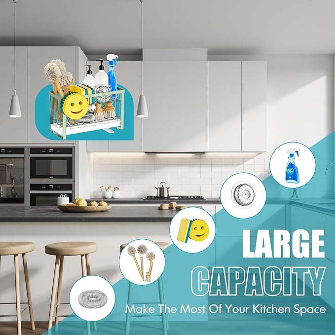 - DOUBLE-LAYER CAPACITY:The upgraded sponge holder comes with a 2 tier sink rack and a brush holder.Holds 2 soap dispenser,sponges,scrubber,sink stopper,steel wool etc.The added movable smiley sponge holder provides extra storage for your smiley sponge.It has a large capacity but occupies a very small space,making it suitable for kitchens with limited space and keeping sink countertops clean and tidy