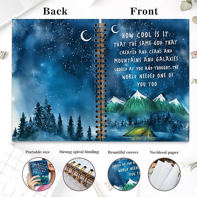 - 2.Bible Journaling Hardcover Spiral Notebook The notebook has a double spiral design, the sturdy spiral binding allows the notebook to lay flat, making it easy to write on both sides of the page. made of thick paper, prevents ink from leaking, safe, easy to write