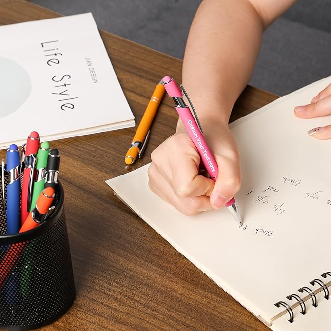 Custom Pens Personalized in Bulk – Engraved with Name, Text on Both Sides – Multiple Colors – Black Ink Ballpoint Pens with Stylus – Great for Business, Events, Parties, Marketing, Gifts
