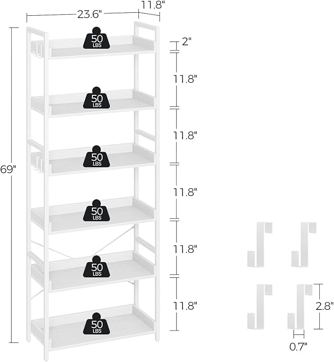 Rolanstar Bookshelf 6 Tier with 4 Hooks, Industrial Wood Bookcase, Vintage Storage Rack with Open Shelves, Rustic Standing Bookshelves Metal Frame Display Rack for Living Room, Bedroom, White