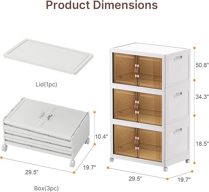 480Qt Stackable Storage Bins with Lids, 3 Pack Large Collapsible Bins with Wheels, Plastic Cabinet with Doors, Foldable Closet Organizers and Storage for Home, Dorm, Office, White