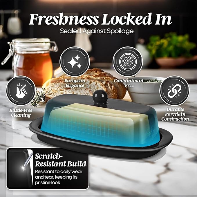 - Pure and Safe: Crafted from contaminant-free black porcelain, this European butter dish ensures your butter is not just stored but preserved in a wholesome manner