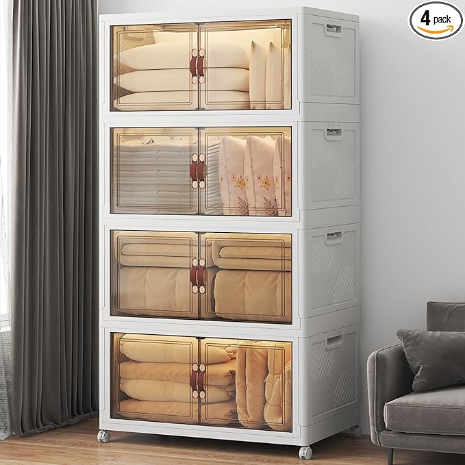 640Qt Stackable Storage Bins with Lids, 4 Pack Large Collapsible Bins with Wheels, Plastic Cabinet with Doors, Foldable Closet Organizers and Storage for Home, Dorm, Office, White