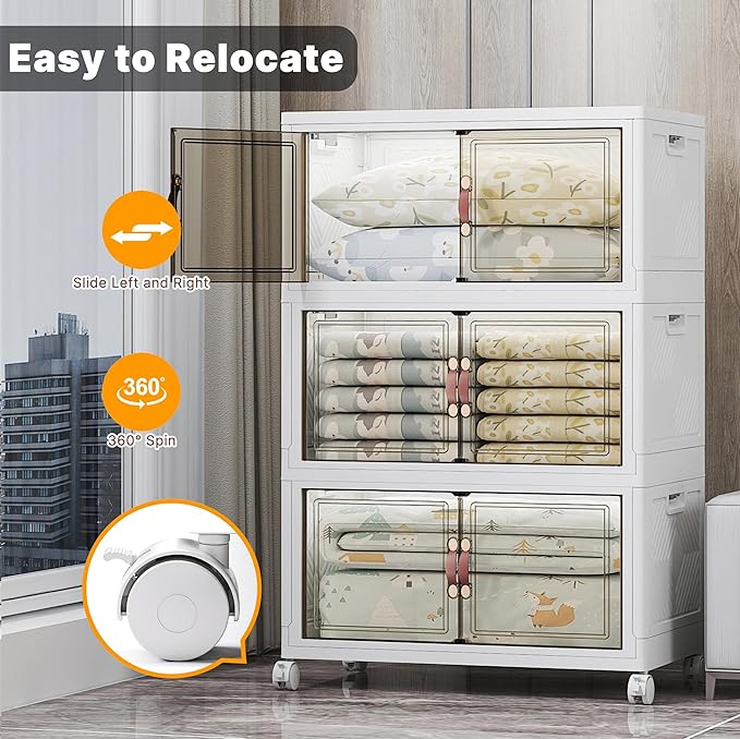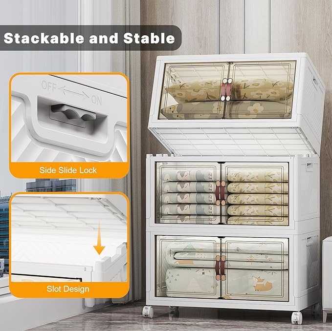 - 【Smooth Mobility with Locking Wheels】: Easily move your storage wherever you need it. These stackable storage bins with wheels feature four smooth-rolling casters, including two locking brakes, keeping your bins stable yet mobile — great for bedrooms, dorms, or offices.