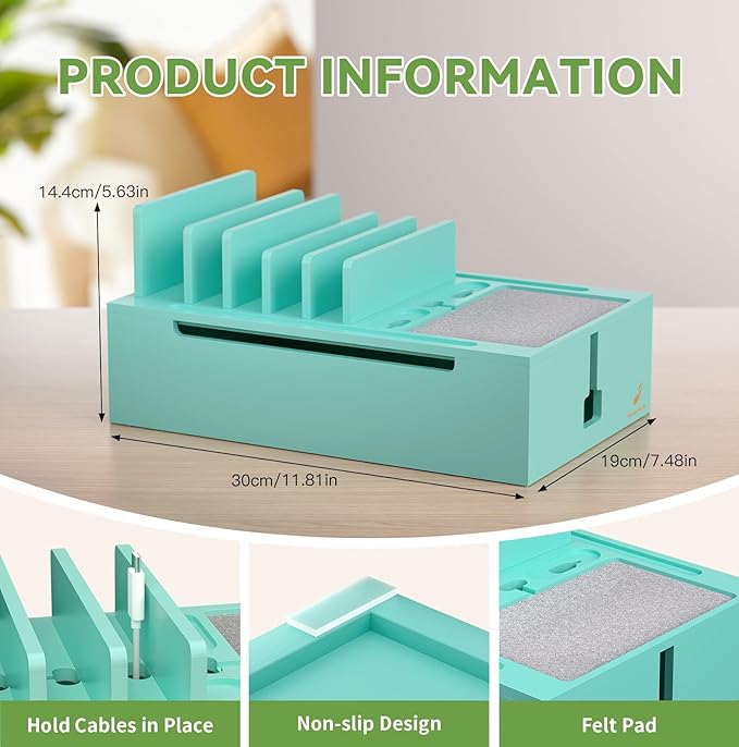 - Larger and Wider Base: The dock Station have a larger and wider base (Size 28 x 15 cm) sultable for a variety of power supplies. It can easily store the power strip and hide the cables for greater safety. Four anti-slip pads on the bottom increase the stability