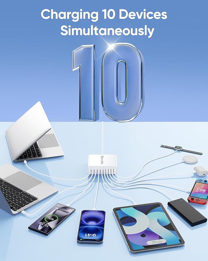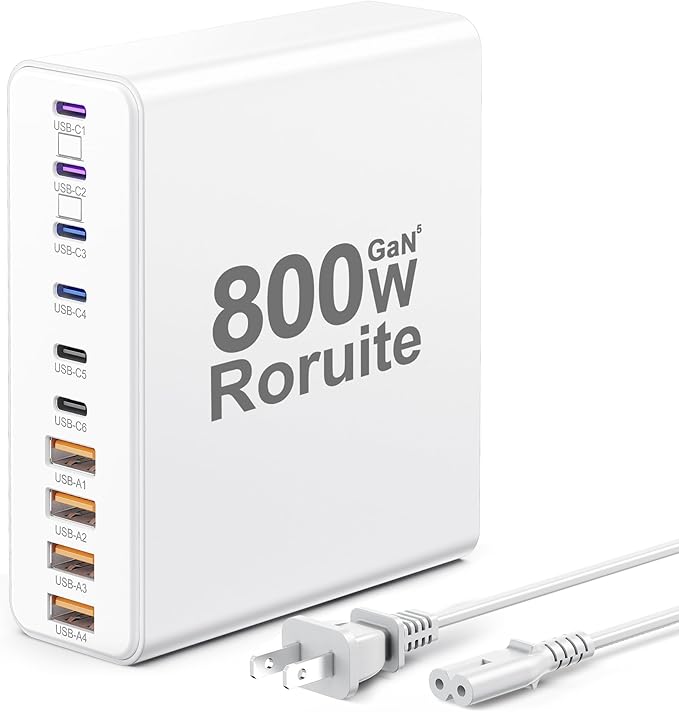 - 【800W Multiport USB C & A Charging Station】 This 10-port USB-C charger block from Roruite is the ultimate charging solution for multiple devices. Equipped with 6 USB-C charging ports and 4 USB-A charging ports, it features intelligent power distribution that quickly formulates the shortest charging plan for you—powering up all your devices at the fastest possible speed with no waiting time. Notably, our 120W super fast charger is 3x faster than a regular 65W charger.