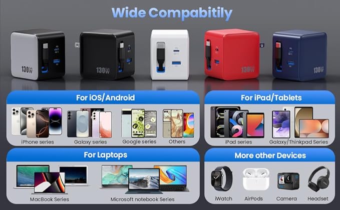 - 【Compact & Portable Design】The USB C charger block allows you to say goodbye to multiple bulky chargers. With Upgraded GaN technology, this 130W usb c power adapter equiped with a foldable plug and reduces its size by 50% compared to the original and other 130W power adapter. Size: 2.5x2.5x1.1inch, weight: 7.01oz. It makes sure that your mobile phone and other items are free from the risks of scratches when you put them in the same bag.