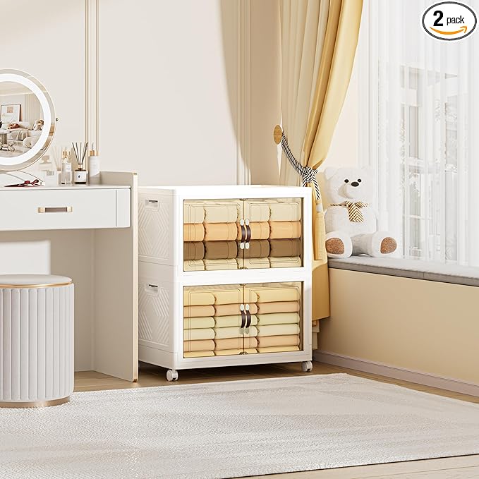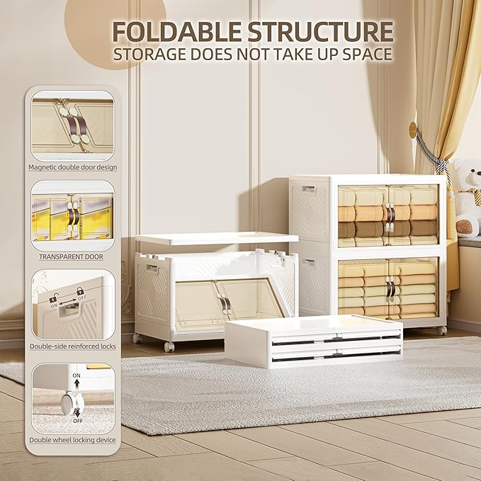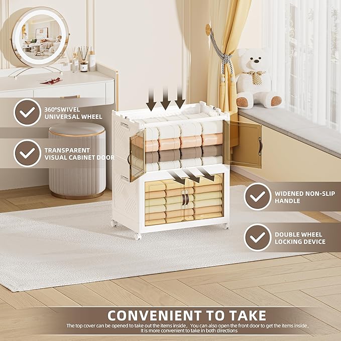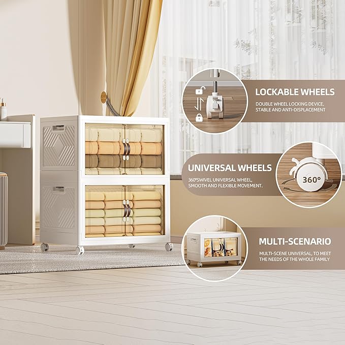 168 QT / 42 Gal Heavy Duty Double Door Storage Cabinet - Magnetic Closure, Foldable Stackable Design with Wheels & Leather Handles, Plastic Organizer for Garage/Bedroom