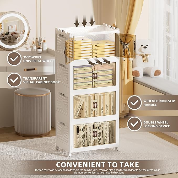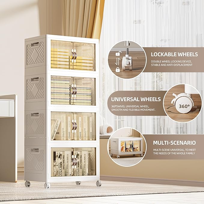 200 QT / 50 Gal Rolling Foldable Storage Cabinet with Stackable Feature - Double Magnetic Doors, Leather Handles, Durable Plastic for Closet/Office, Easy Assembly & Move