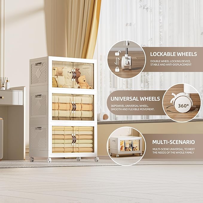 200 QT / 50 Gal Extra Wide Foldable Plastic Cabinet with Double Magnetic Doors & Leather Handles - Stackable, 4 Locking Wheels, Space Saving Storage for Small Spaces