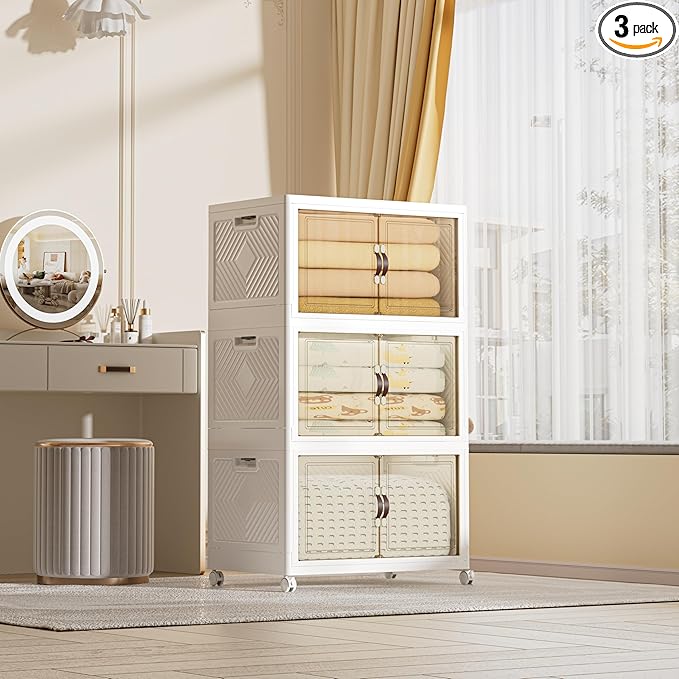 312 QT / 78 Gal Large Foldable Stackable Plastic Storage Cabinet with Double Magnetic Doors, Leather Handles & 4 Wheels - Organize Home, Office, Closet
