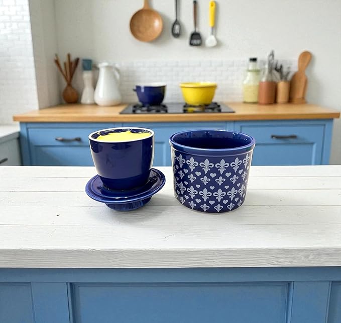 - Unique Retro Design: One‑of‑a‑kind French butter crock with proprietary pattern and bell‑jar silhouette. This ceramic butter dish with lid is a stylish, practical butter container for counter that keeps room temperature butter fresh, soft, and spreadable—great retro/farmhouse kitchen decor.