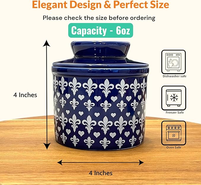 - Premium & Safe Build: High‑fired New Bone China porcelain butter crock is durable, chip resistant for daily use. Right capacity holds around 6 oz (about 1–1.5 sticks). Features a snug‑fit lid, non‑slip base, and easy‑grip handle—great hostess, housewarming, or wedding gift.