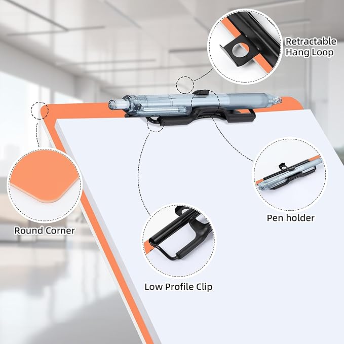 - Retractable Hanging Ring: The hanging clipboard has a retractable hanging ring on the top for easy access, you can hang it up to display the contents of your clipboard or hang it on the wall when not in use to save storage space. The low profile clip is ideal for stacked storage.