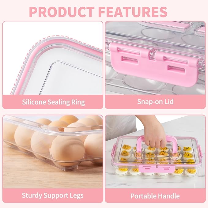 Deviled Egg Containers with Lid and Handle, Durable Clear Plastic Deviled Egg Carrier Storage 24 Eggs, Stackable Egg Holder for Fridge, Portable Tray Platter for Party & Picnics-1 Pack Pink