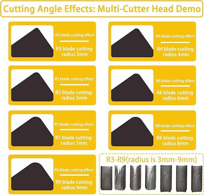 - [7 INTERCHANGEABLE BLADES (R3-R9)]- Precision round corner cutter includes 7 easily interchangeable blades offering a wide radius range from R3 (3mm) to R9 (9mm). Long-lasting blade pads significantly extend the life of the 7 interchangeable cutting blades. Built for demanding workshops, copy centers, and print shops needing reliable, high-capacity corner rounding