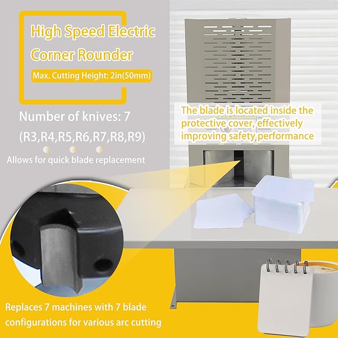 - [STRONG SAFETY PERFORMANCE]- The electric corner rounder designed with robust metal safety guard completely encloses the sharp blades during operation, ensuring risk-free corner rounding. Designed with operator safety as paramount, the user can safely operate the machine and is kept away from the blades. And the foot pedal control design maximizes operator safety and efficiency, allowing precise cutting while keeping both hands free to position materials
