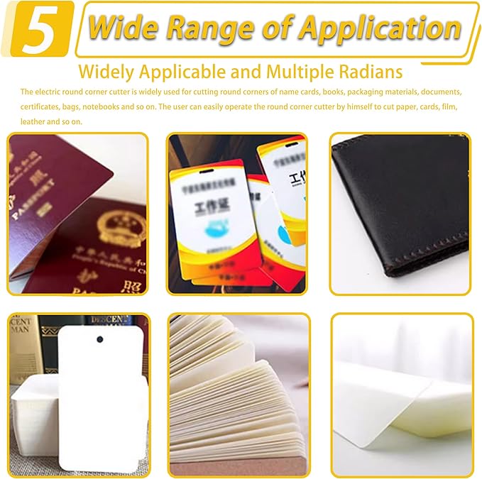 - [WIDE APPLICATION]- This versatile electric corner rounder boosts workshop output with the machine's powerful 120W motor delivering 56 precise cuts per minute. The electric round corner cutter is widely used for cutting round corners of name cards, books, packaging materials, documents, certificates, bags, notebooks and so on. It is easy to operate even for new beginners. The user can easily operate the round corner cutter by himself to cut paper, cards, film, leather and so on