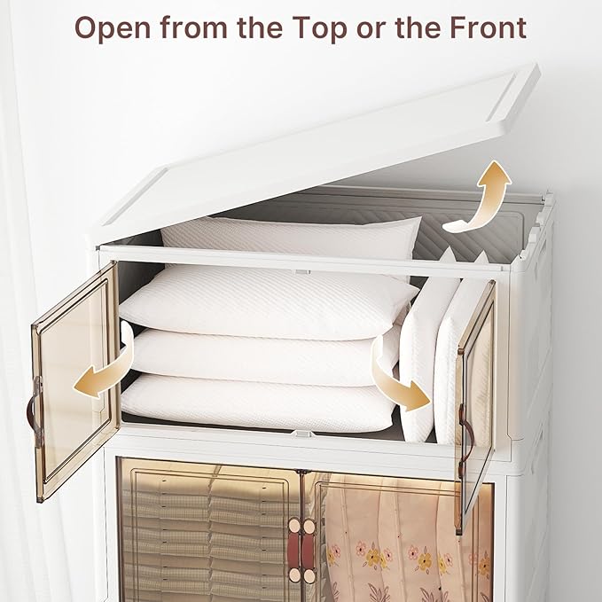 - 4. FRONT DOOR & TOP LID FOR EASY ACCESS: Front door for instant item retrieval; top lid for full coverage. No lifting or unstacking required. Note: these closet organizers come with 2 LIDS.