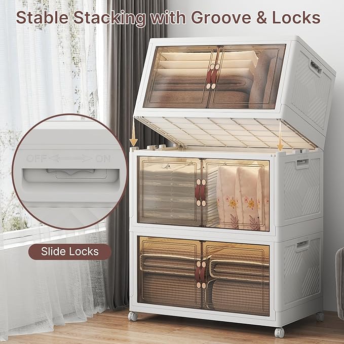 - 5. STABLE STACKING & SMOOTH ROLLING: Interlocking grooves + dual side locks keep bins firmly stacked (even tall piles). Equipped with 360° smooth-gliding wheels for flexible mobility.