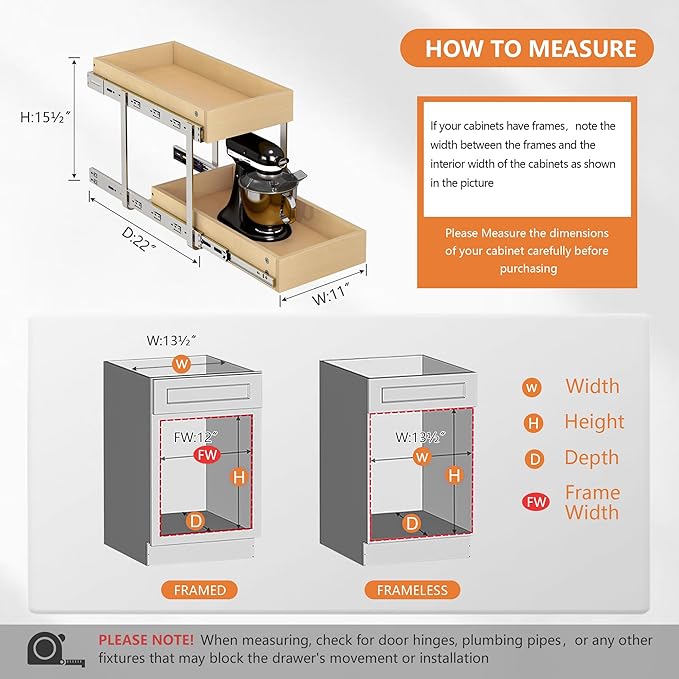 - 【Easy Bottom Assembly & Universal Fit】Designed for bottom-mount installation, this pullout cabinet organizer fits most standard cabinets. Includes pre-drilled holes and all necessary hardware for quick setup. Measure your cabinet interior before ordering for the perfect fit.