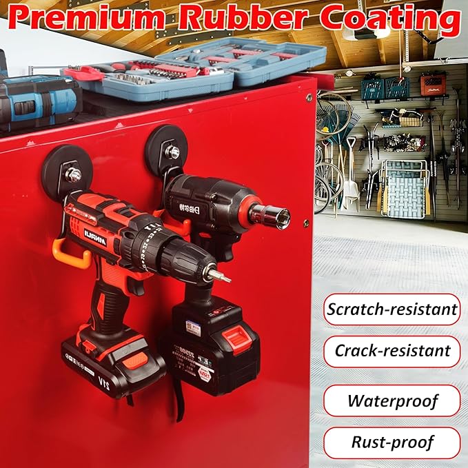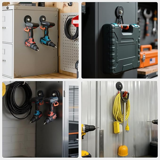 - Utility Garage Hooks for Organizer: These heavy-duty magnetic hooks support up to 20lbs, ideal for hanging items like cordless impact drivers, tool boxes, garden shovels, or trailer cords. The strong magnets provide secure holding without any drilling.
