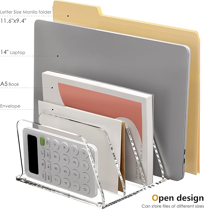 - šļø MAIL ORGANISATION DISTRIBUTION SHELF: This vertical desktop organizer is made of high quality acrylic material and features a fully transparent design that clearly displays the centre tab of each folder, allowing you to locate the folder with just one swipe. Open design, folders can be quickly accessed for storage. Suitable for home, office, school and other places.