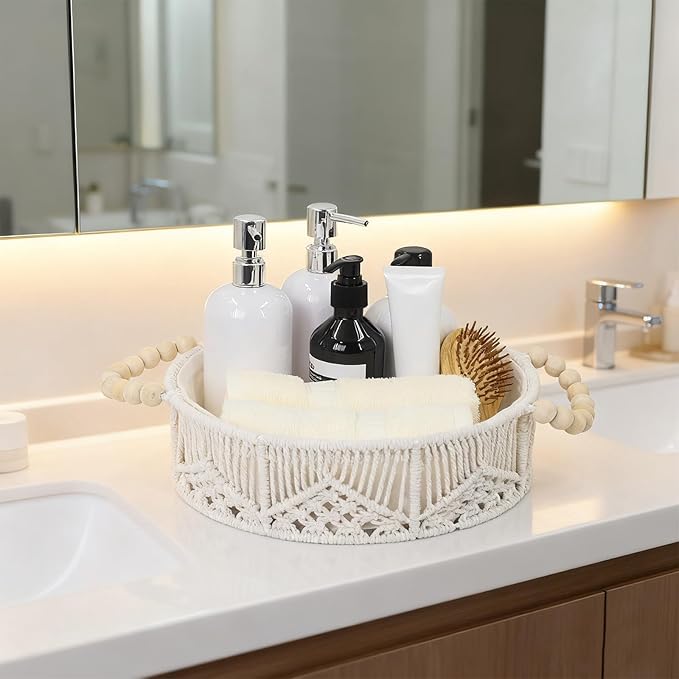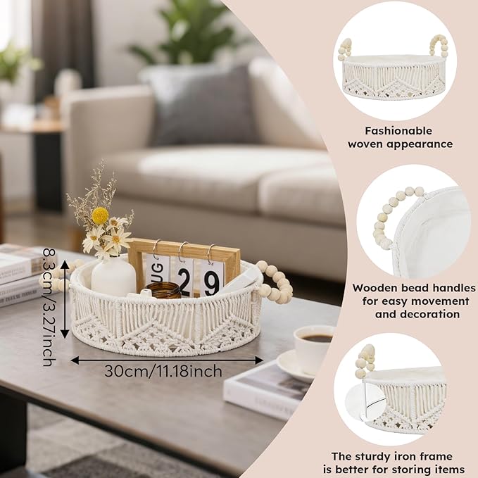 - Widely Use: This macrame white basket is versatile—it can add an elegant touch to the bedroom, living room, bathroom, nursery, floating shelves, over-toilet storage shelf, end table, nightstand, kitchen, office, storage cabinet, bookcase, or any area you love, effortlessly blending with your existing room decor.