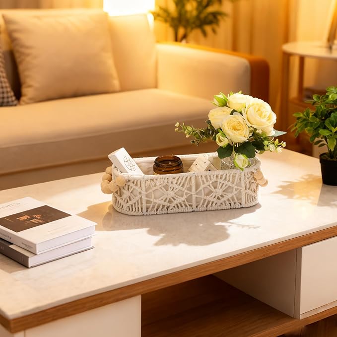 Small Storage Basket for Organizing, Woven Boho Decor Oval Macrame Toilet Paper Baskets for Toilet Tank Top Living Room Bedroom Entryway Decorative Counter Home Decor, Set of 2, White