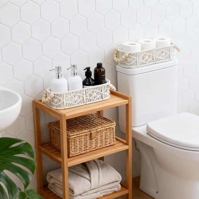 - Widely Use: This white basket is versatile, it can add an elegant touch to bedroom, living room, bathroom, nursery and space-floating shelves, over toilet storage shelf, end table, nightstand, kitchen, office, storage cabinet, bookcase or any area you love, effortlessly blending with your existing room stuff.