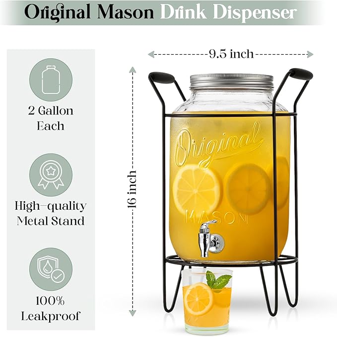- 2-PACK ORIGINAL MASON DRINK DISPENSERS: Pack of 2 original Mason drink dispensers with a classic metal stand and stainless steel lid, featuring the iconic Mason symbol.