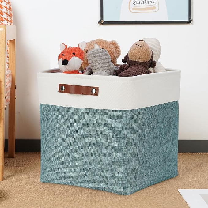 - PREMIUM QUALITY AND LEATHER HANDLE: The outside of these cube storage baskets are made of EV material and the inside is linen. The EV material makes the whole product more three-dimensional, and the linen closet organizers and storage baskets inner layer is more comfortable. No worry about sturdy issue, there is metal bracket to support it. The basket with leather handle is easy to grab and the quality of construction is very good.