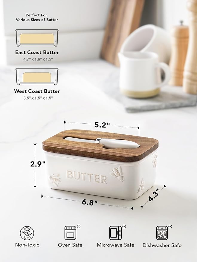 - Capacity For Various Butters: Measuring 6.8" L x 4.3" W x 2.9" H, this ceramic butter dish is spacious enough to hold one stick of either East Coast or West Coast butter. Its deep design helps prevent the butter from sticking to the wooden lid. The body is made of high-quality ceramic, heavy, solid and durable, Acacia wood lid, which is more durable, moisture-resistant, and aesthetically pleasing than ordinary wood lid