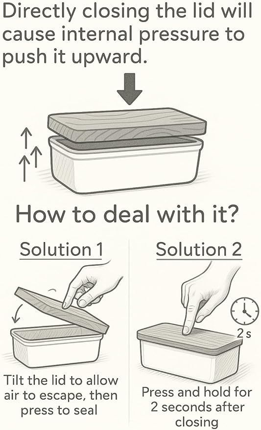 - How to Close the Lid: The lid features a highly flexible silicone ring that provides excellent sealing. However, trapped air inside may push upward, making it difficult to close properly. To ensure a tight seal, press down firmly for 1–2 seconds after placing the lid. Alternatively, you can put the lid on at a slight angle and lower it slowly to allow excess air to escape. *If the lid too tight to open later, try opening it from one corner first to release the air pressure inside. This will make it easy to open