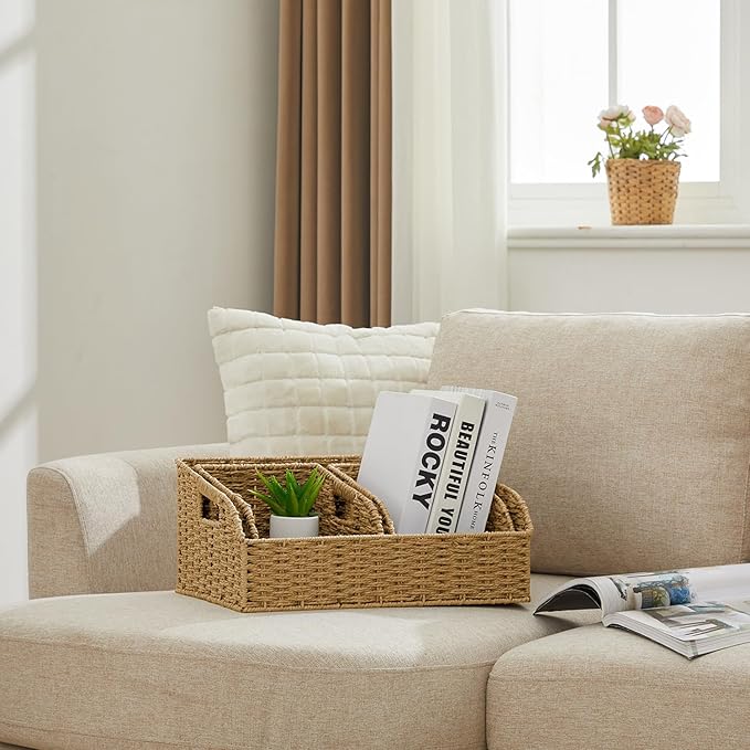 Wicker Baskets for Organizing,Pantry, Kitchen Counter with Handles, Handwoven Woven Storage Baskets for Fruit, Bread, Vegetable, Paper Storage Bins for Shelves, 3 Pack, Natural