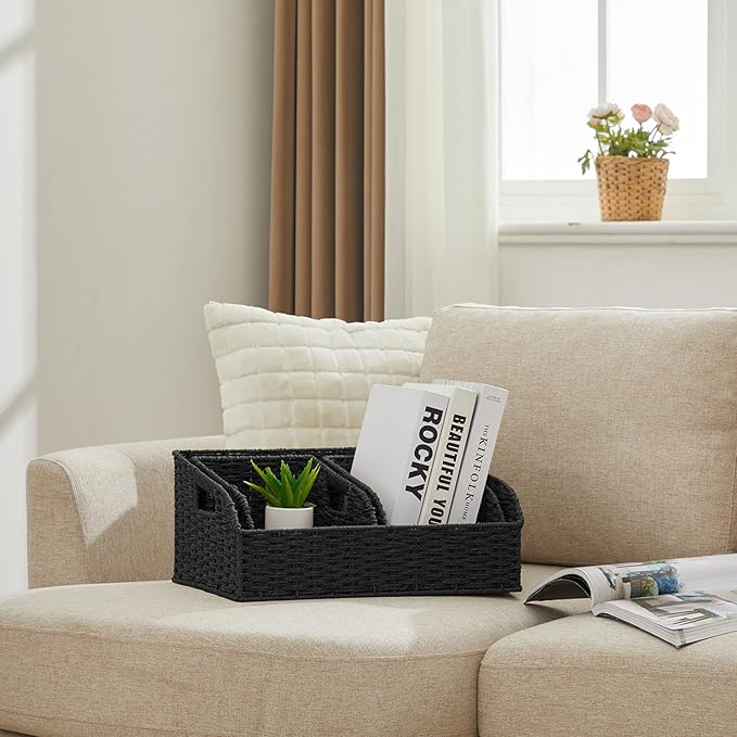 Wicker Baskets for Organizing,Pantry, Kitchen Counter with Handles, Handwoven Woven Storage Baskets for Fruit, Bread, Vegetable, Paper Storage Bins for Shelves, 3 Pack, Black