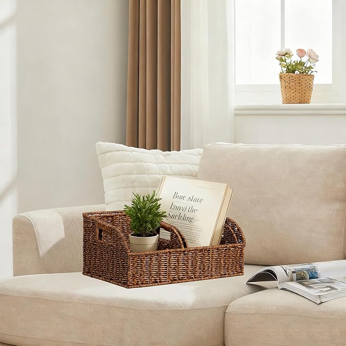 Wicker Baskets for Organizing,Pantry, Kitchen Counter with Handles, Handwoven Woven Storage Baskets for Fruit, Bread, Vegetable, Waterproof Plastic Storage Bins for Shelves, 3 Pack, Brown