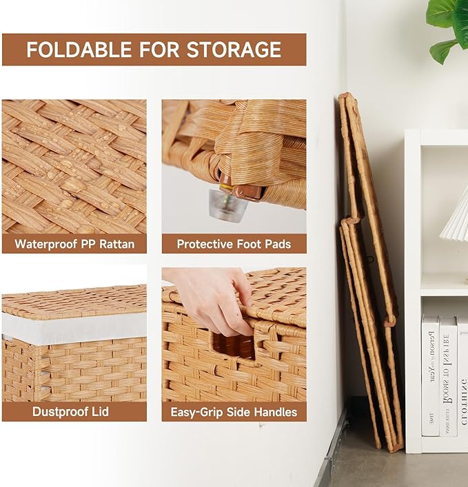 - Thoughtful Details for Everyday Ease: Handmade Woven storage basket with lids is made of waterproof PP rattan. We included handles on the basket. Just grab the sturdy side handles and move the wicker basket wherever you need it. You can also slide it across the room with peace of mind, as the four floor-protector feet on the bottom prevent scuffs and reduce noise.