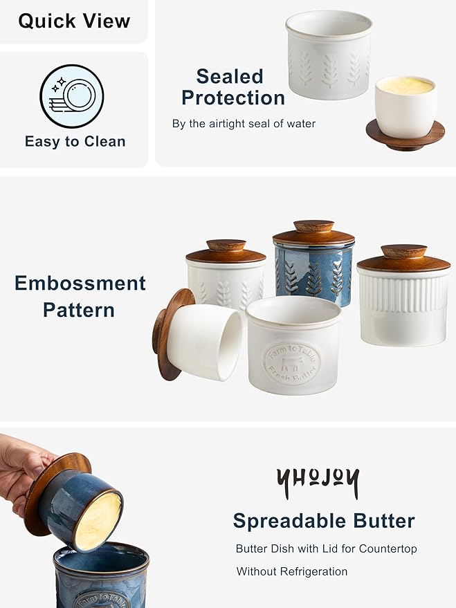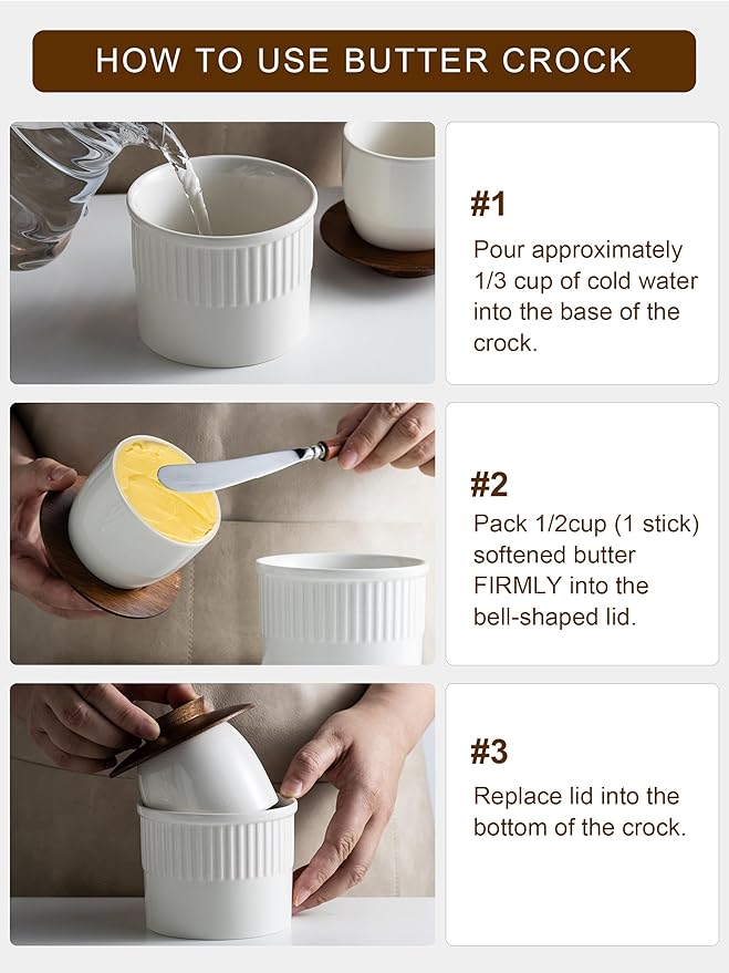 - Easy to Use Butter Keeper – Simply pour 1/3 cup of cold water into the base, then pack the inverted lid firmly with softened butter. Place the lid into the butter crock to create a natural water seal that locks in freshness and flavor. Tip: Replace the water every 2–3 days for maximum freshness