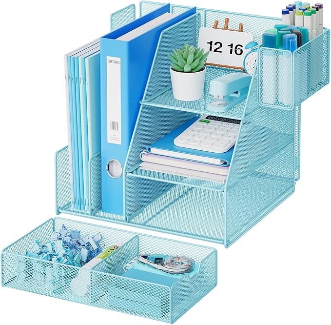 Marbrasse Desk Organizer and Accessories, 3-Tier File Organizer with Drawer and Pen Holder, Small Desktop Organizer and Storage for Workspace Office Supplies Blue